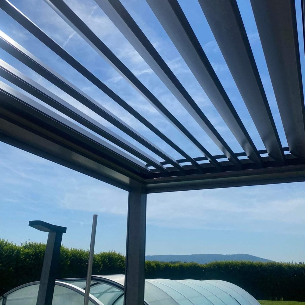 - Das Pergoladach besteht aus beweglichen, kammerförmigen Aluminiumlamellen