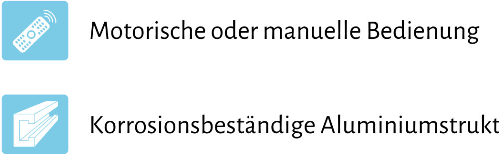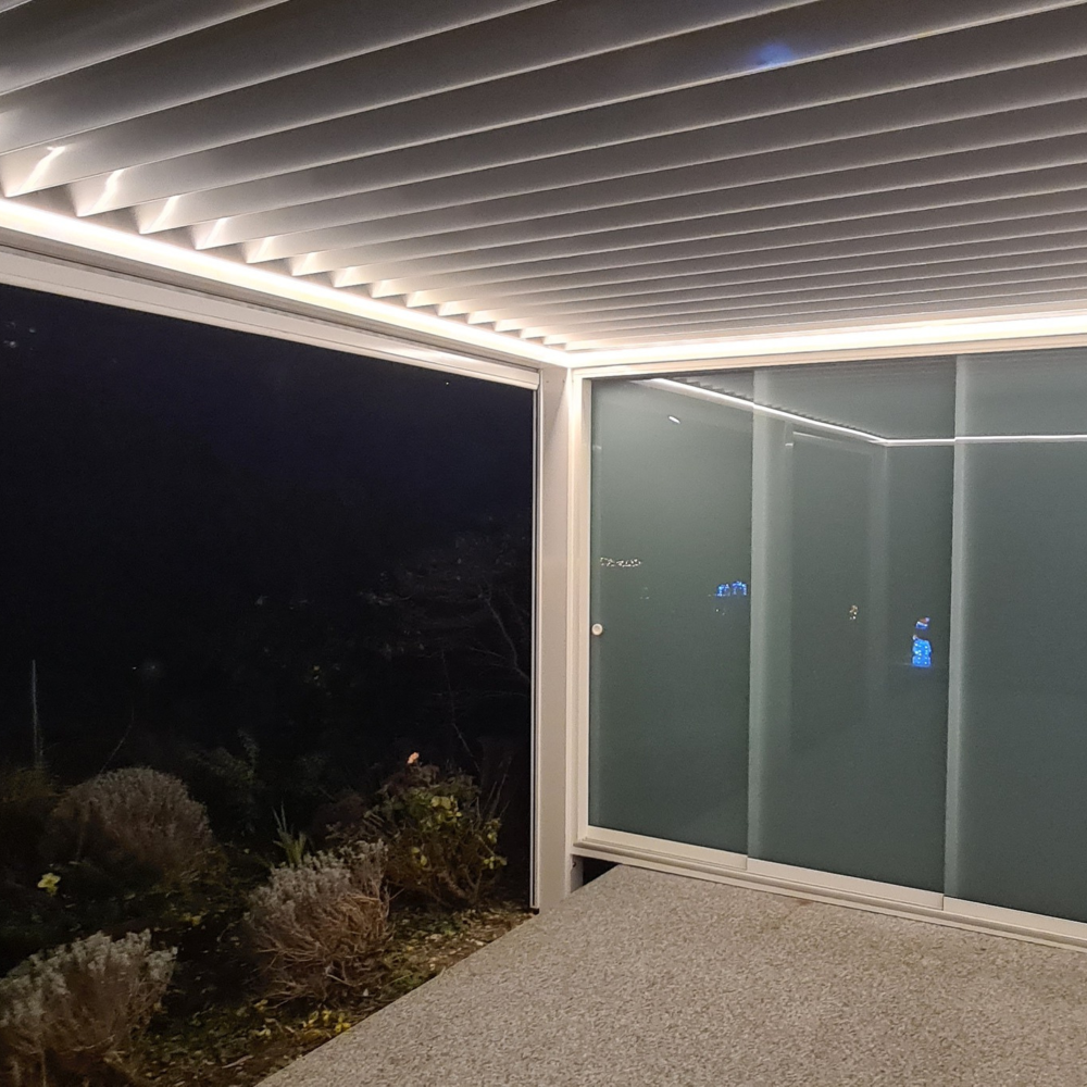 - Optional integrierbare Komfortelemente: Heizstrahler, lineare LED-Beleuchtung, ZIP-Screen-Seitenbeschattungen, feste Lamellenpaneele und Schiebewände aus Glas