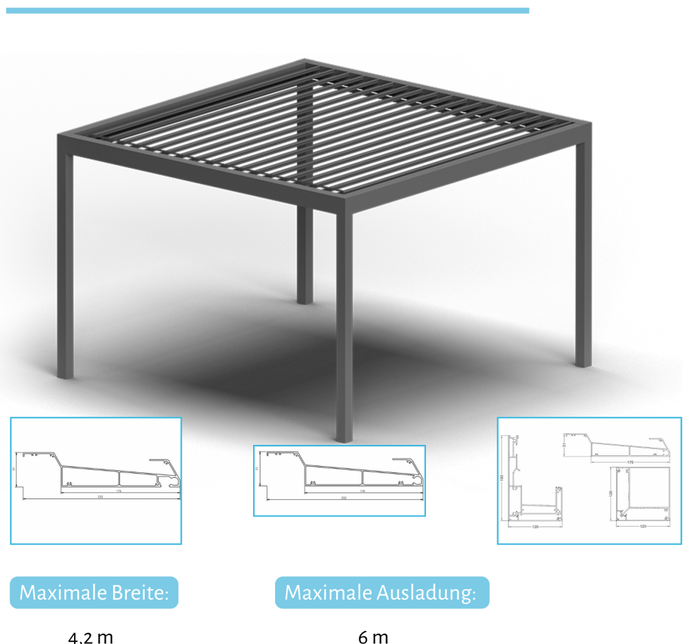 - Lamellen des Dachs bis zu 135° flexibel drehbar
