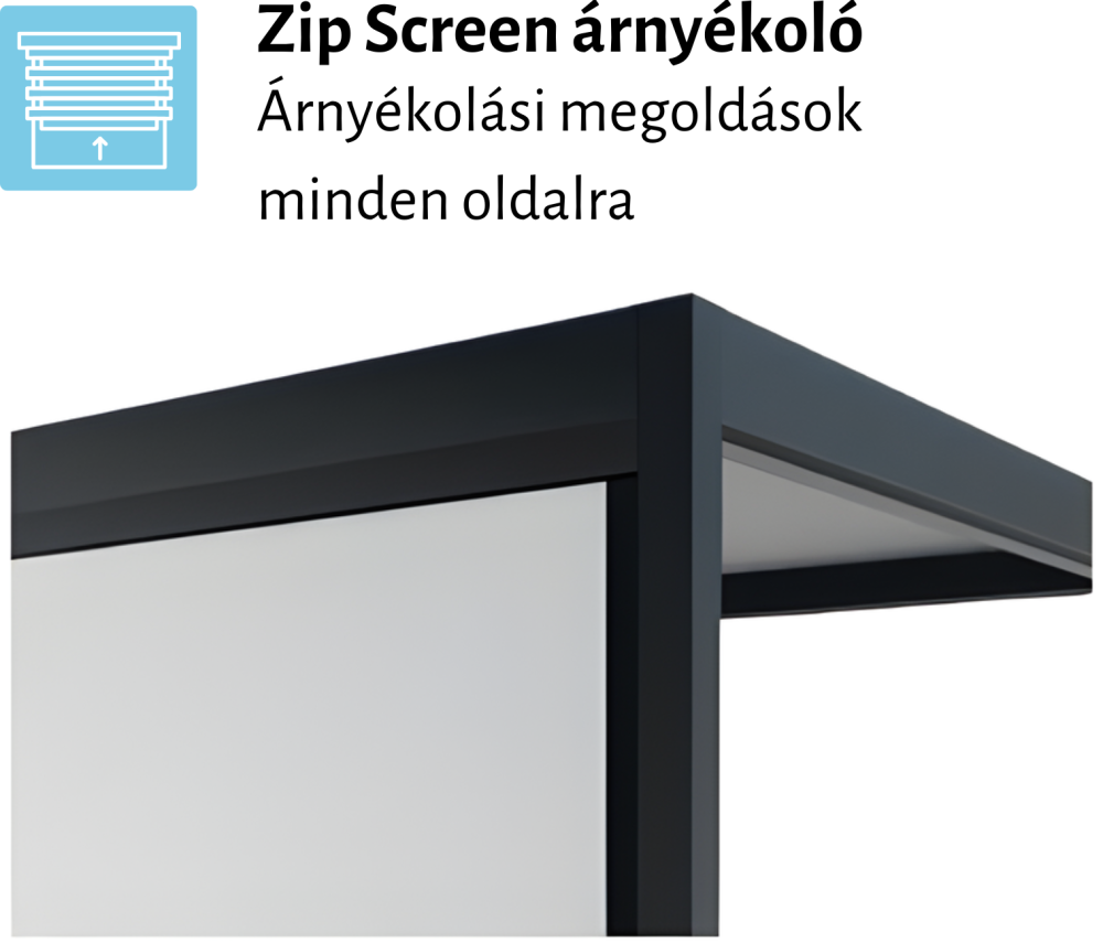 - beépíthető kényelmi elemek: hősugárzó, LED lineáris világítás, Zip Screen oldalsó árnyékolók, fix lamellás panelek és eltolható üvegfalak